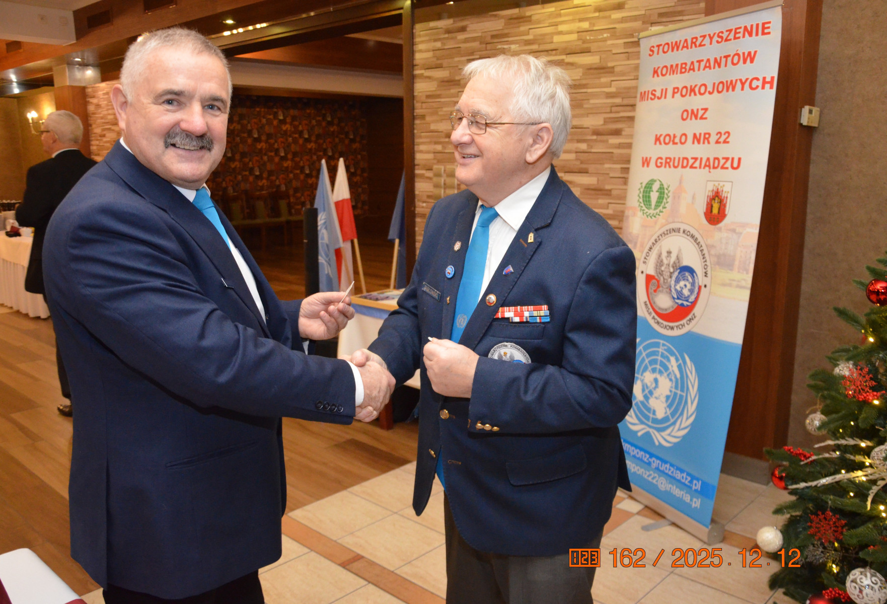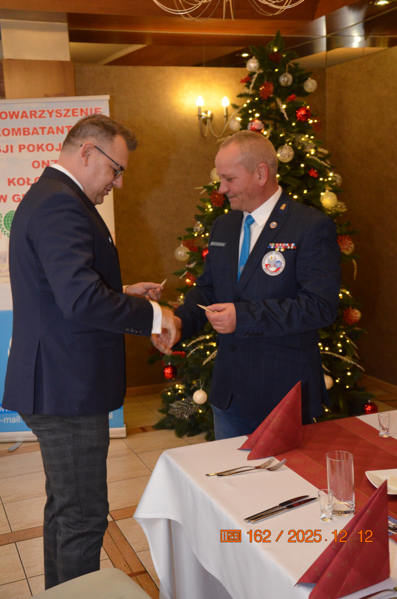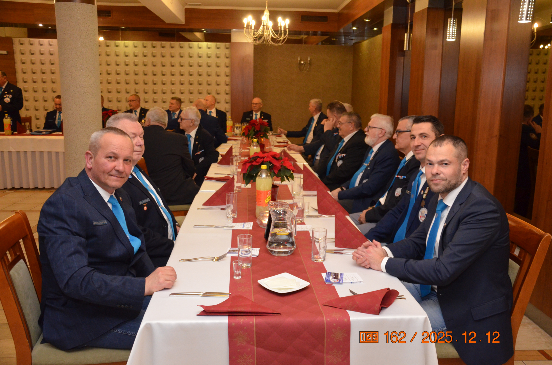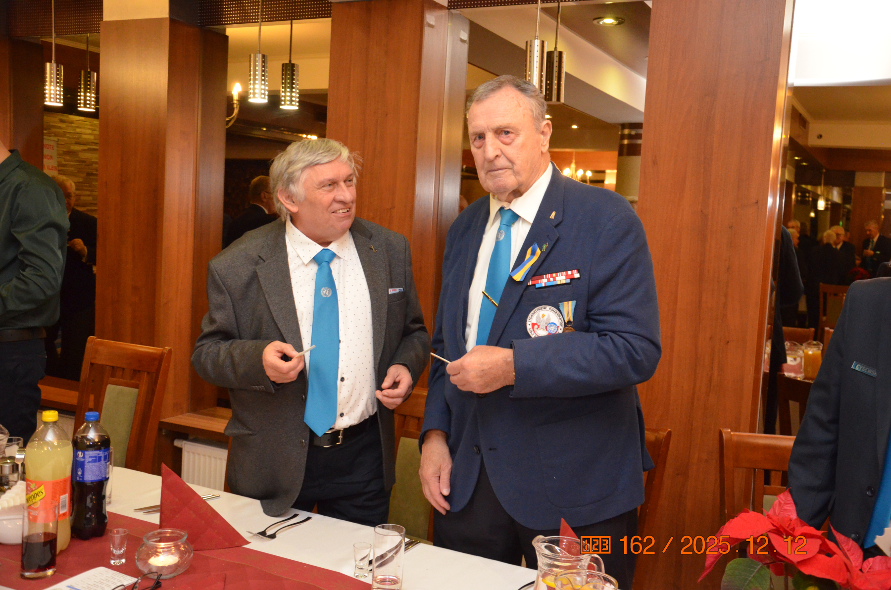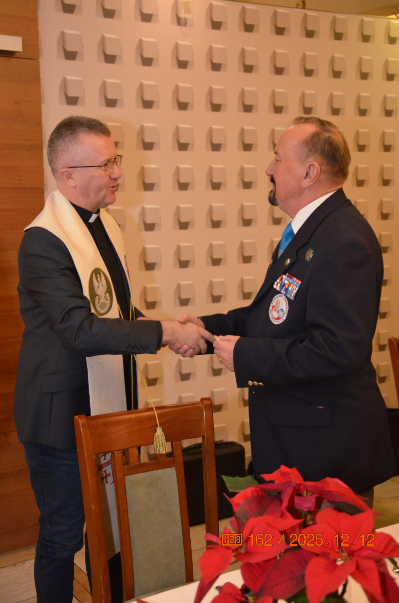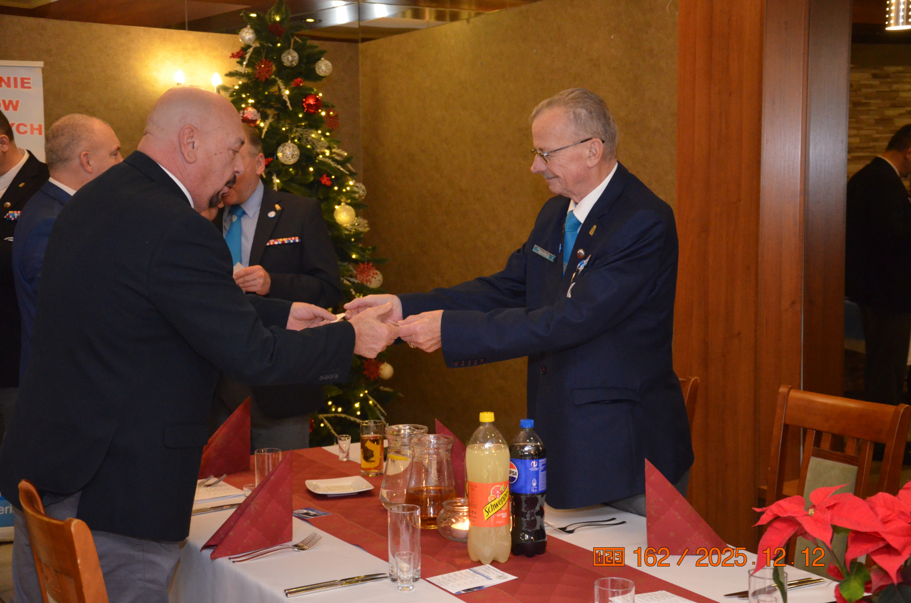 W dniu 12.12.2025 r., w gościnnych progach restauracji Hotelu RAD spotkaliśmy się na tradycyjnym i uroczystym spotkaniu świąteczno – noworocznym. „Nadchodzący czas to chwile radości, ale też zadumy…” – tymi słowami powitał wszystkich zebranych Prezes Zarządu Koła kol. Leszek KAZNOWSKI. W ten szczególny czas przywołaliśmy kolegów, którzy w bieżącym roku odeszli na wieczną wartę śp. Jerzego PALIKOWSKIEGO i śp. Edwarda SROKĘ. Minutą ciszy oddaliśmy im hołd i wszystkim weteranom, którzy polegli, zmarli i służyli poza granicami państwa, a których nie ma już z nami. Dziękujemy zaproszonym gościom, Kapelanowi grudziądzkiego Garnizonu ks. mjr. Włodzimierzowi SKOCZEŃ, członkom wspierającym Stowarzyszenie kolegom: Edwardowi PROSOTOWICZOWI, Jackowi URBAŃCZYKOWI i Józefowi JABŁOŃSKIEMU za obecność i wspólnie spędzony czas. W licznym gronie weteranów naszego Koła wspominaliśmy wigilijne spotkania spędzone kiedyś – z dala od bliskich i rodzin. Uroczystość była również okazją do wyróżnienia weteranów naszego Koła pamiątkowymi medalami i certyfikatami. Wręczone zostały również legitymacje Stowarzyszenia. Życzymy wszystkim radosnych Świąt Bożego Narodzenia!
